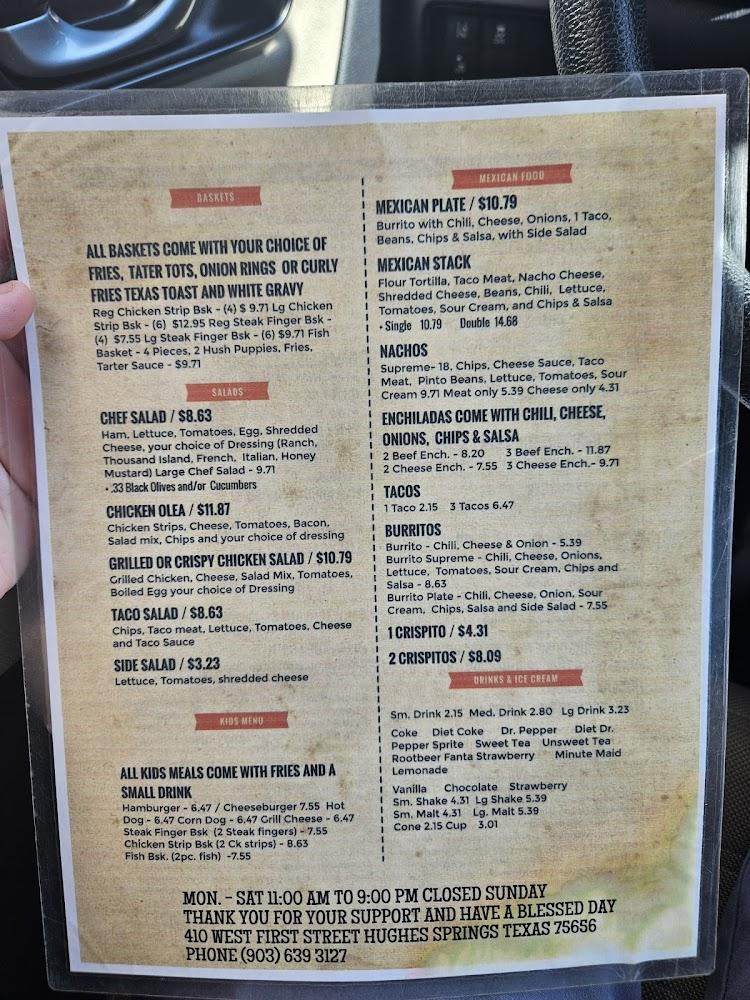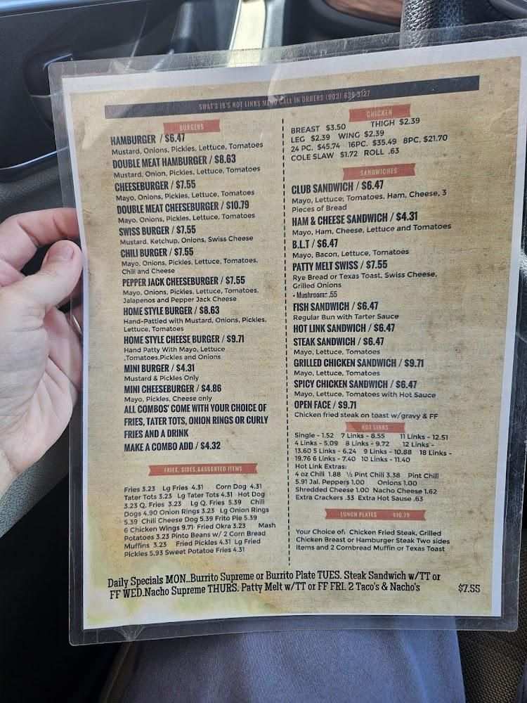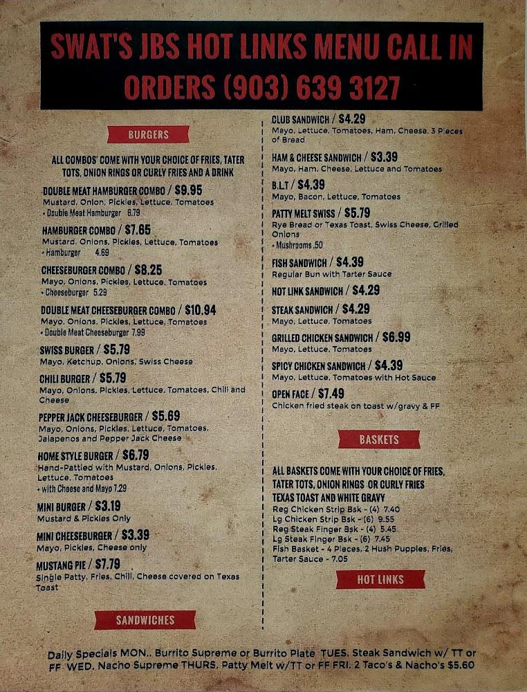 Welcome to SWAT'S J B's Hot Links, your go-to destination for American cuisine in Hughes Springs, TX! Conveniently located at 410 W 1st, we offer a delightful dining experience with a cozy atmosphere, perfect for lunch, dinner, or a quick bite. Enjoy our expansive menu featuring local specialties, and don't miss our selection of delicious desserts and traditional dishes. We provide a range of services including dine-in, takeout, and delivery, with accessible facilities for everyone. Whether you're dining solo or with friends, we guarantee a fast, friendly service at affordable prices. Come savor the flavors today!